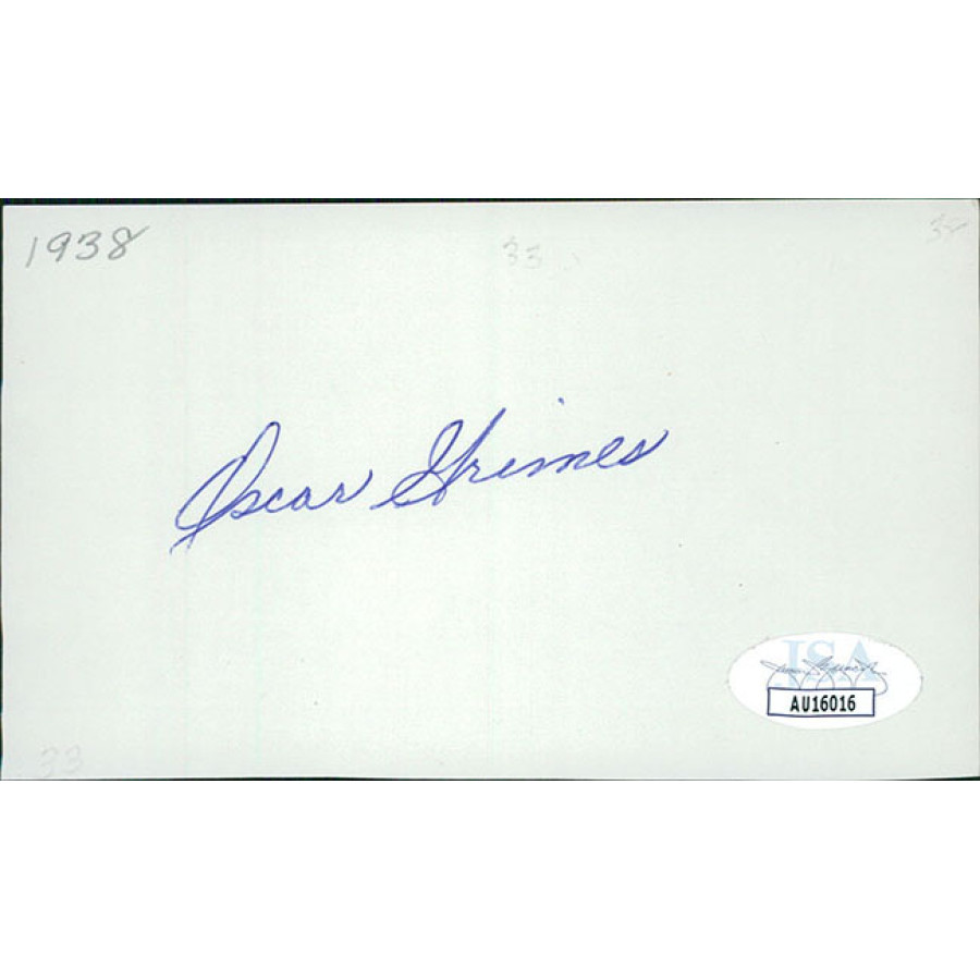 Signed Oscar Grimes 3x5 index card in blue ink. This item has been certified by James Spence Authentication (JSA) with sticker affixed to item and matching card.