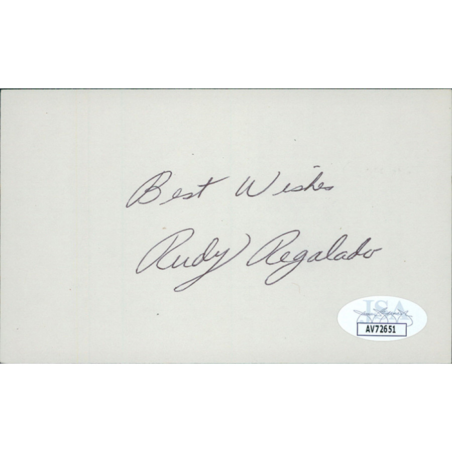 Signed Rudy Regalado 3x5 index card in black ink with "Best wishes" inscription. This item has been certified by James Spence Authentication (JSA) with sticker affixed to item and matching card.