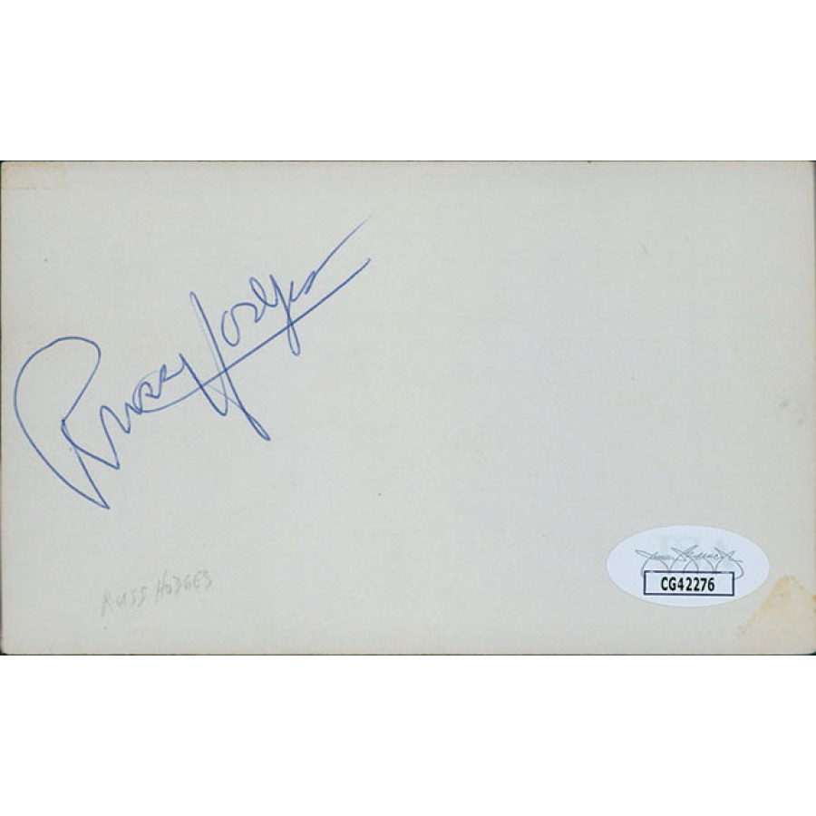 Signed Russ Hodges 3x5 index card in blue ink. This item has been certified James Spence Authentication (JSA) with sticker affixed to item and matching card.