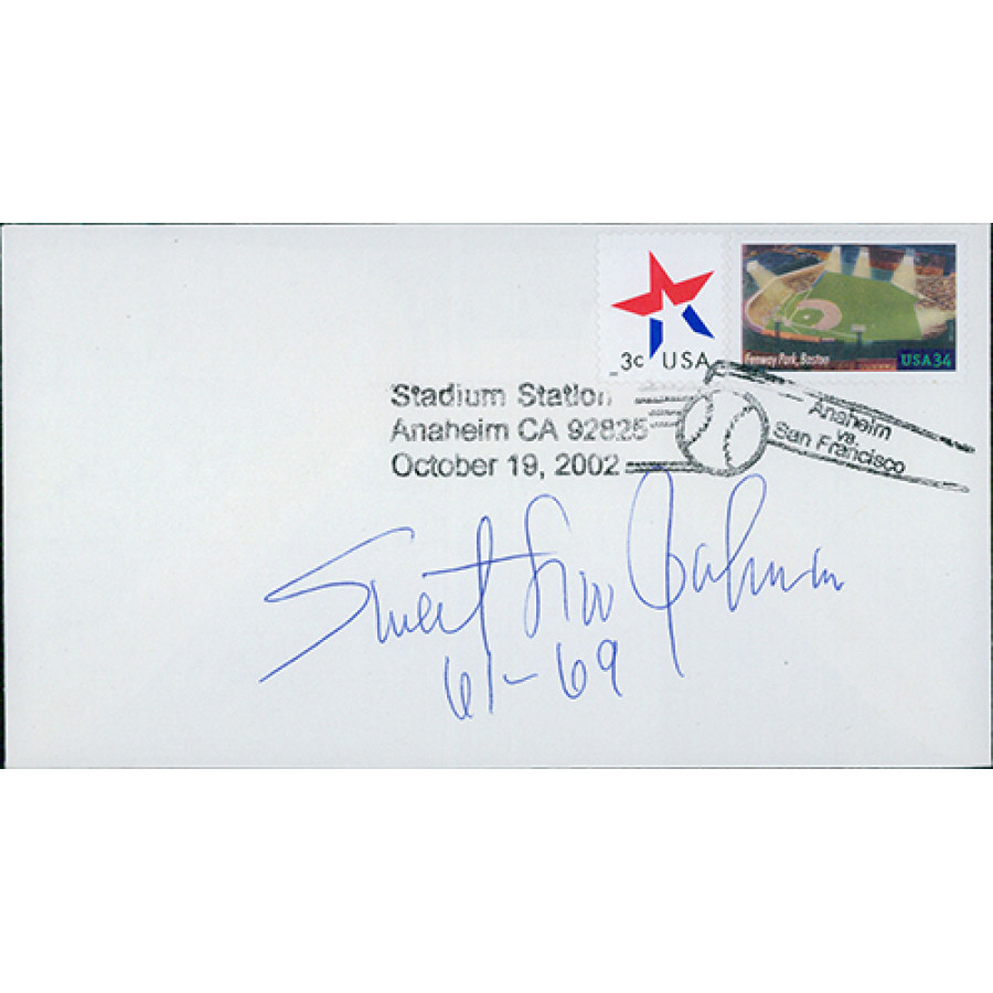 Signed Sweet Lou Johnson Stadium Station Anaheim CA Cachet in blue pen. This item has been certified by James Spence Authentication (JSA) with sticker on item and matching card.
