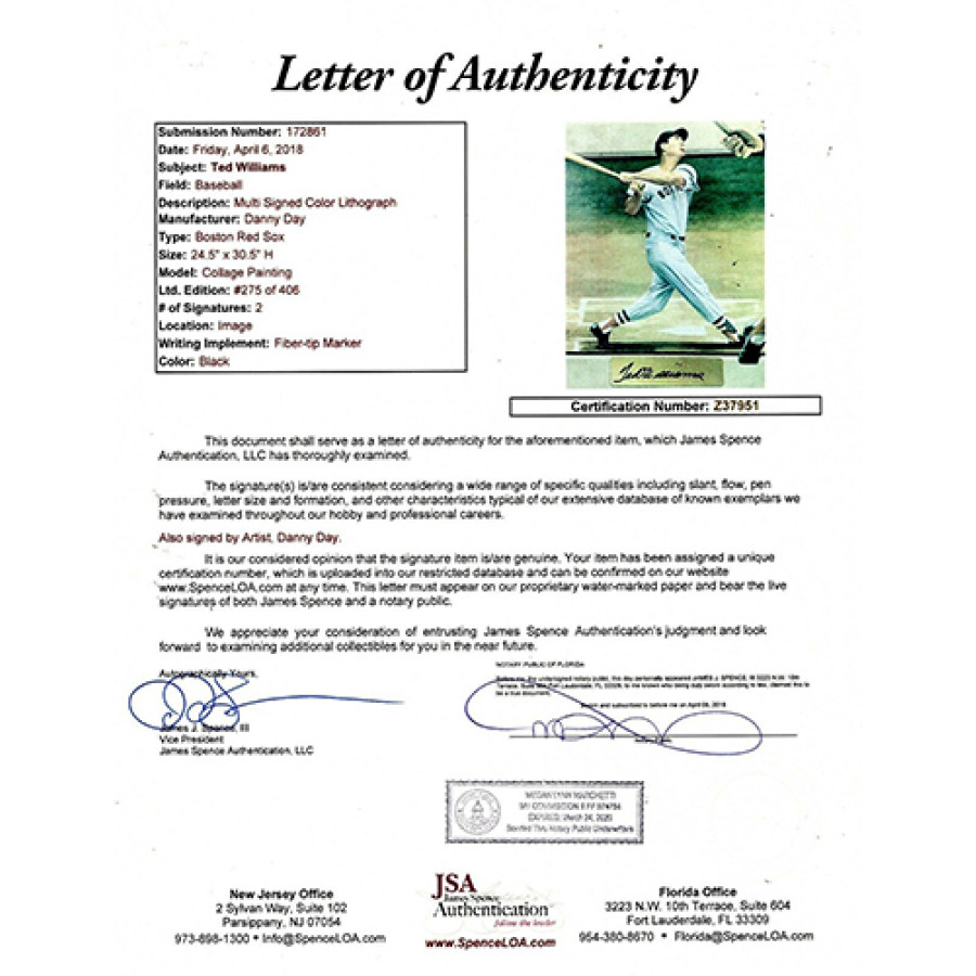 Signed Ted Williams Boston Red Sox 24.5"x30.5" Lithograph from the artist Danny Day. Danny Day has signed and numbered this limited edition lithograph too. This item has been authenticated by James Spence Authentication (JSA) with sticker affixed to item and matching letter of authenticity. This item has never been framed or mounted. NOTE: There are some small crease marks/dents/bent ends/dirt marks.