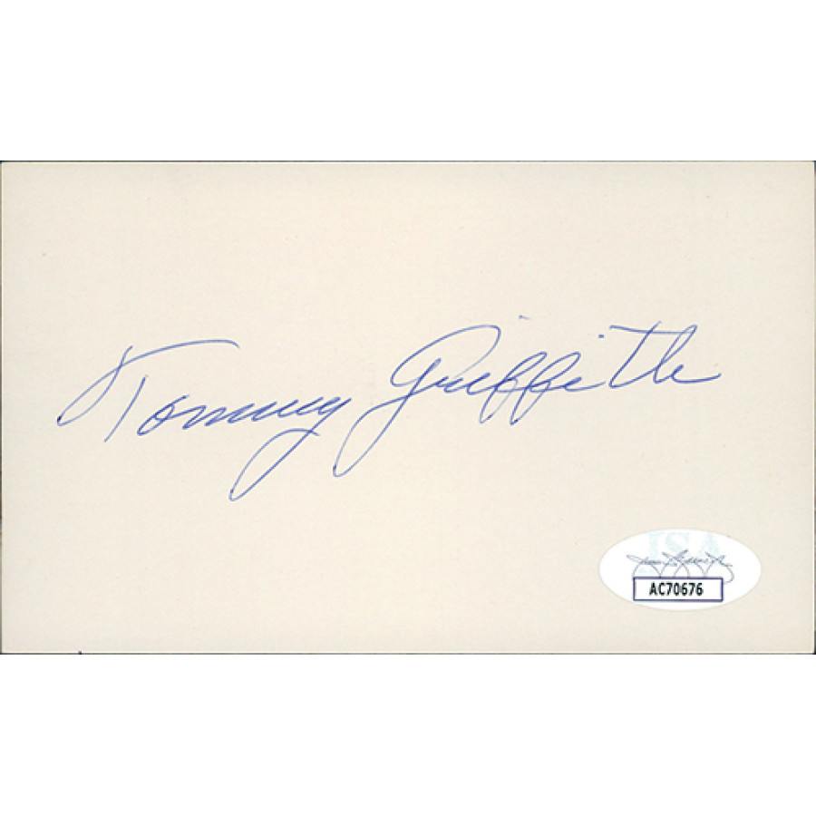 Signed Tommy Griffith 3x5 Index Card in blue ink. This item has been certified by James Spence Authentication (JSA) with sticker affixed to item and matching card.