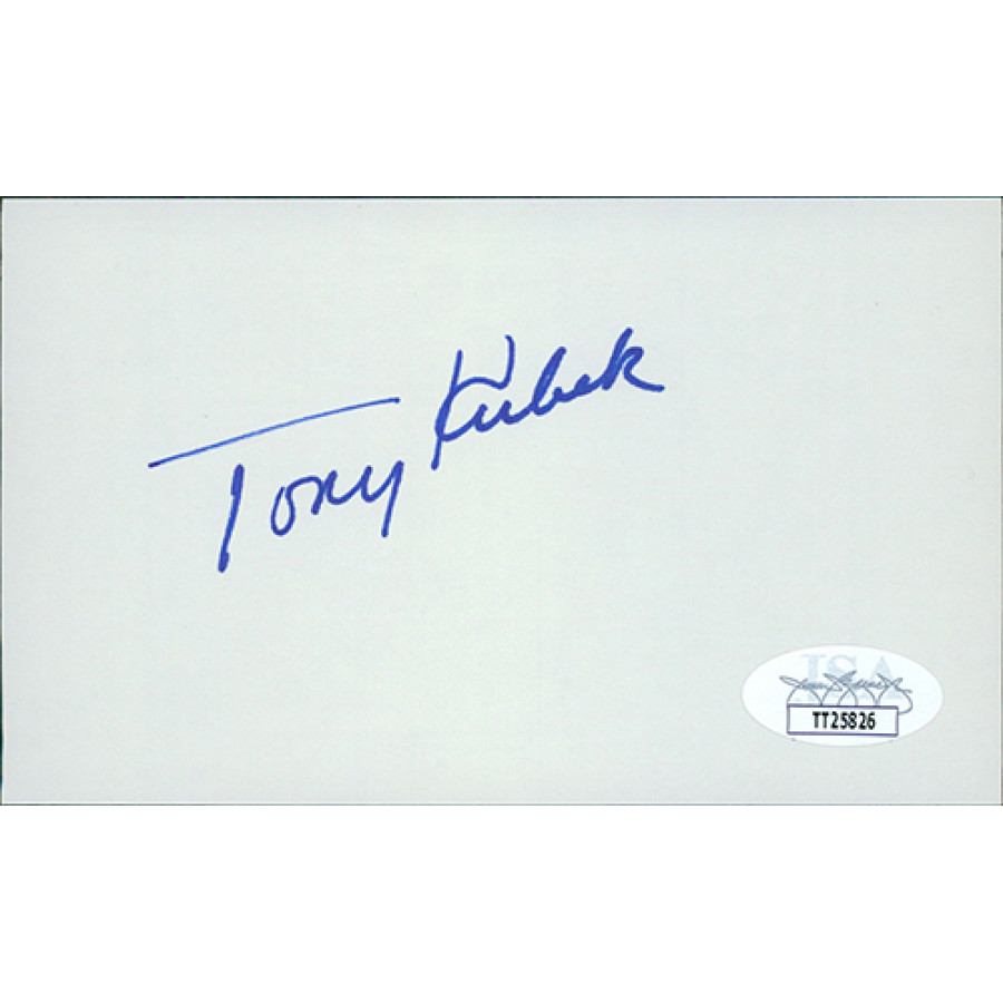 Signed Tony Kubek 3x5 Index Card in blue sharpie. This item has been certified by James Spence Authentication (JSA) with sticker on item and matching card.