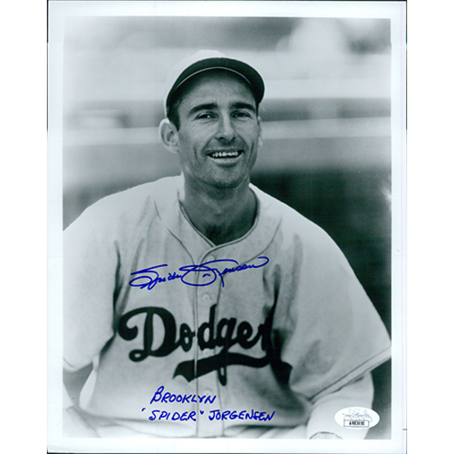 Signed Spider Jorgensen Brooklyn Dodgers 8x10 glossy finish photo in blue sharpie with inscription. This item has been certified by James Spence Authentication (JSA) and will come with a sticker on the item and matching card.