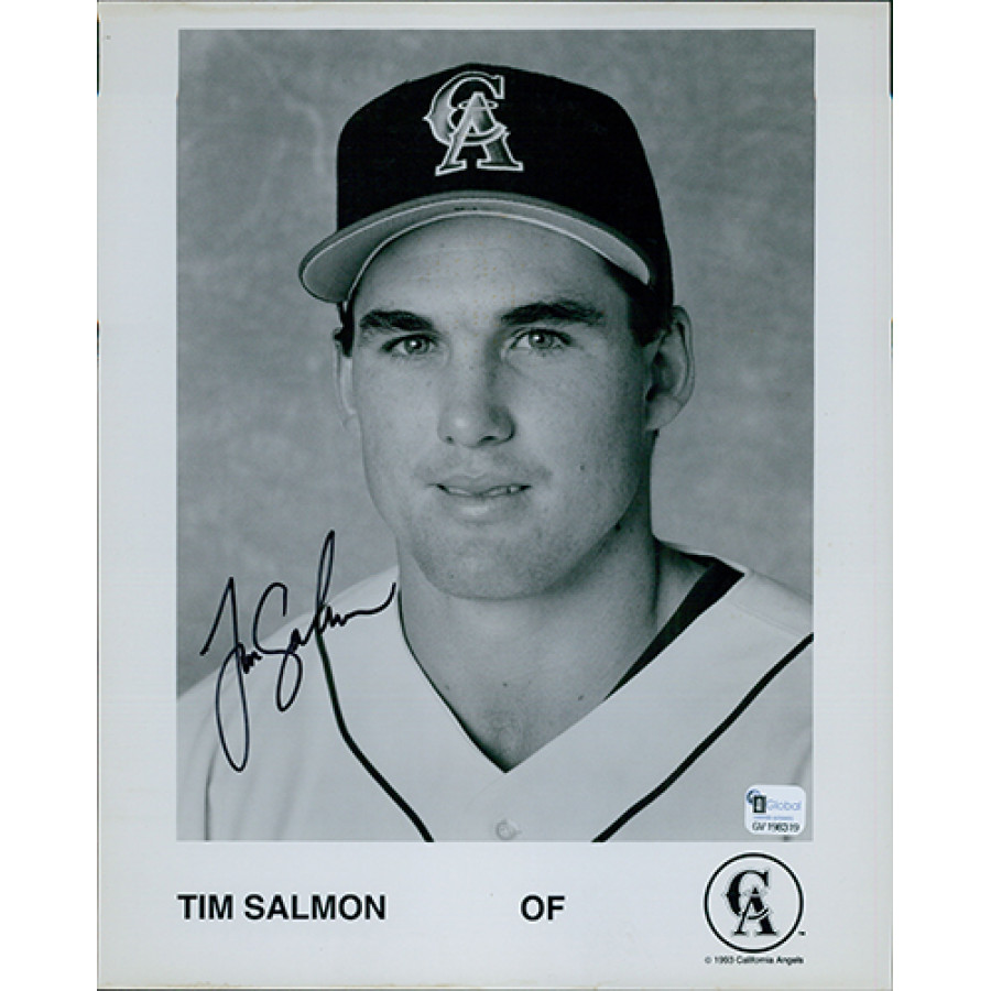 signed Tim Salmon California Angels 8x10 glossy photo in black sharpie. This item has been certified by Global Authentication (GAI) and will come with a sticker on the item and matching card.