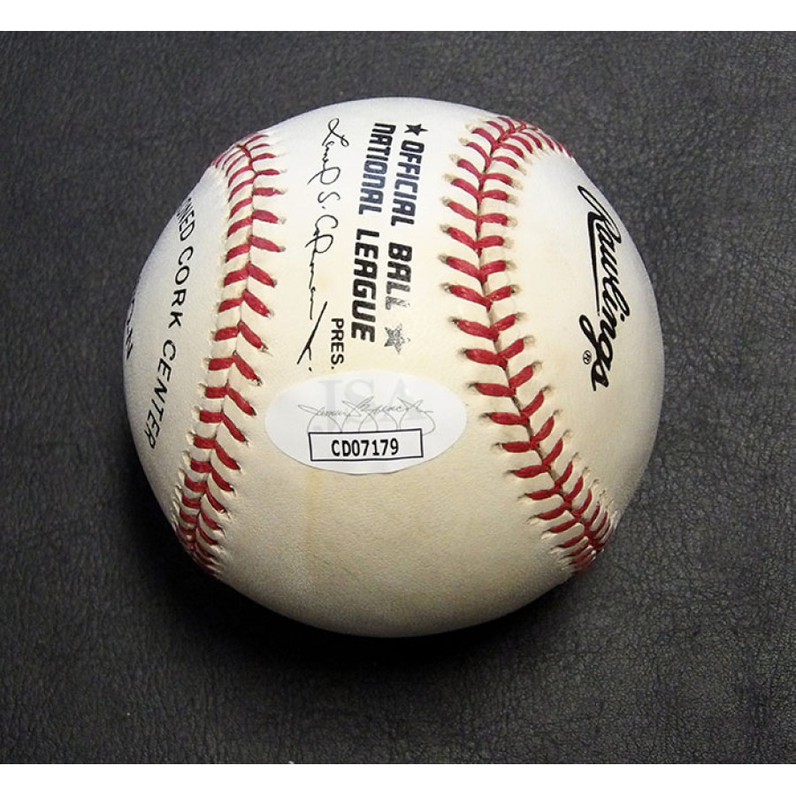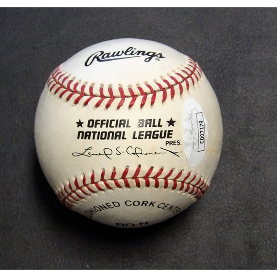 Signed Chynna Phillips official Rawlings National League baseball in blue pen on the sweet spot. The ball has some toning/spotting. This item has been certified by James Spence Authentication (JSA) with sticker affixed to item and matching card.