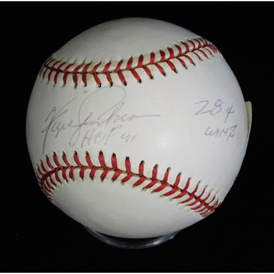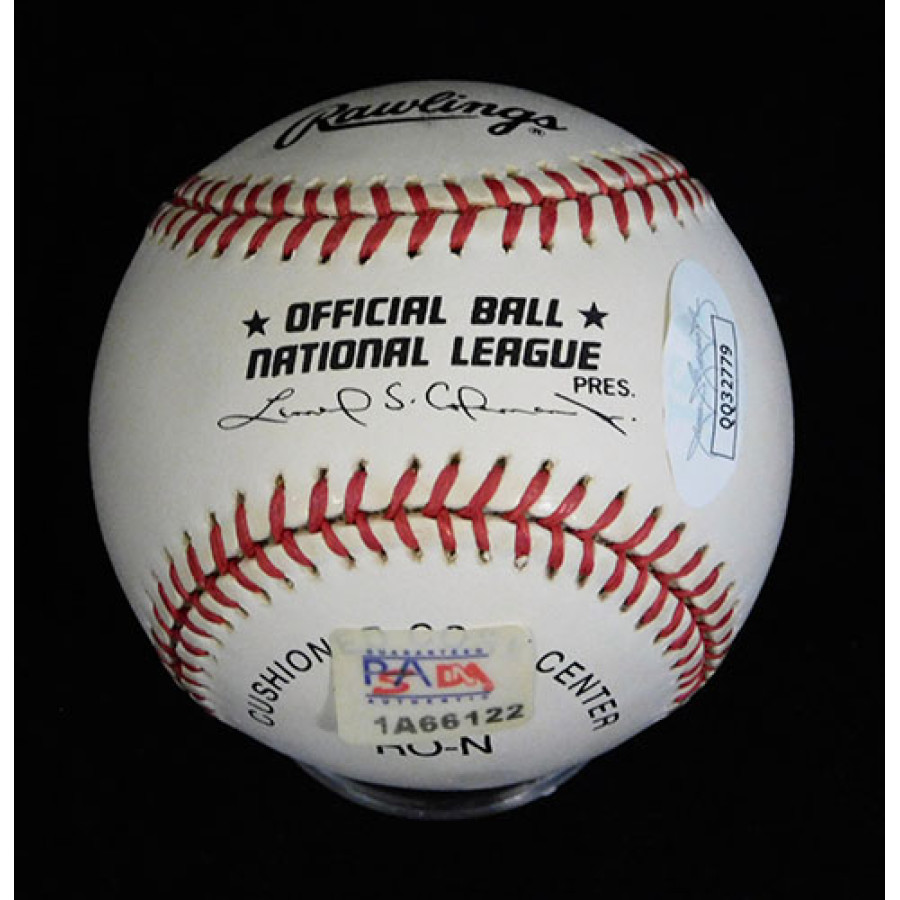 Signed Ferguson Jenkins Official National League Baseball in blue pen on the sweet spot with "HOF 91" and "284 Wins" inscription. The signature is faded. This item has been certified by James Spence Authentication (JSA) with sticker affixed to item and matching card and also certified by Professional Sports Authenticators (PSA) with sticker affixed to the item but the card is missing.