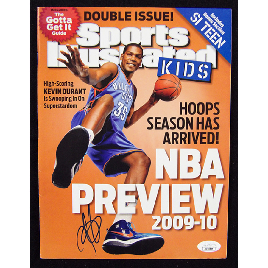 Signed Kevin Durant Oklahoma City Thunder Sports Illustrated Kids November 2009 magazine in blue sharpie on the cover.  This item is certified by James Spence Authentication (JSA) with sticker affixed to item and matching card.