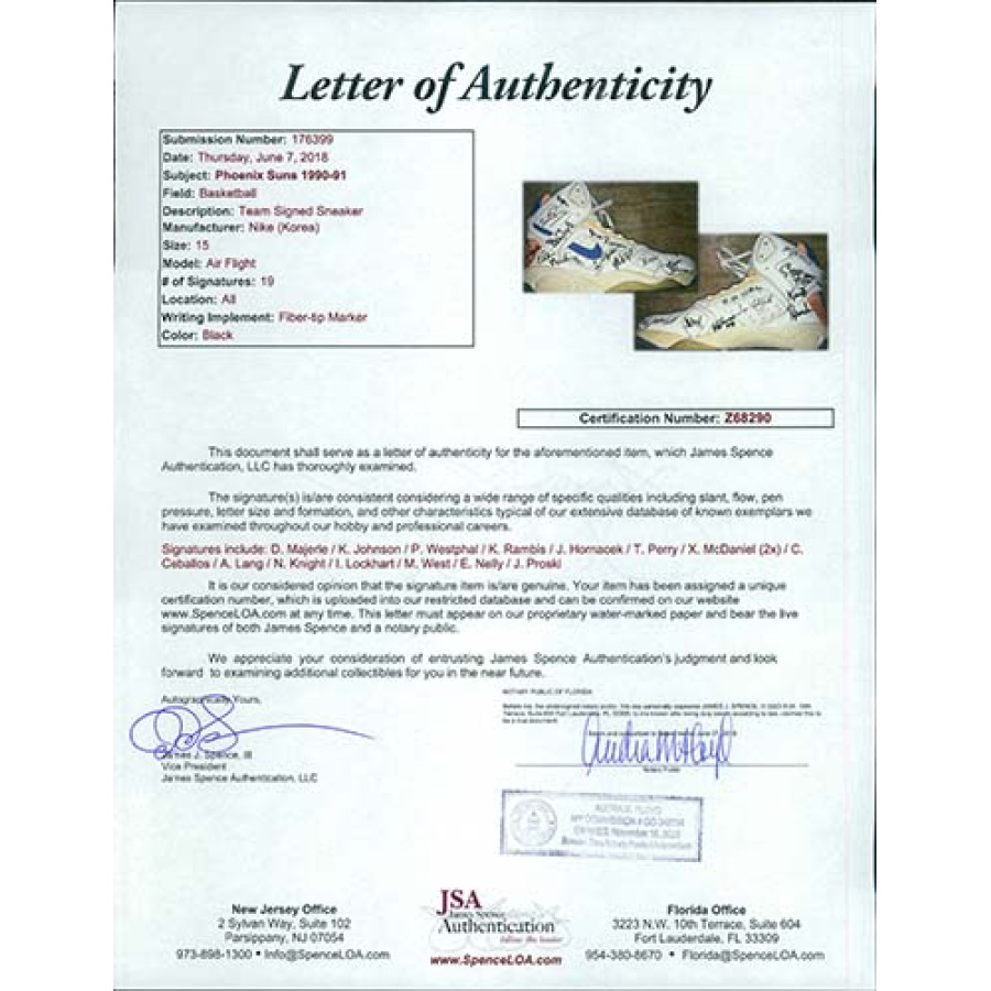 Signed Phoenix Suns 1990-91 Team on Nike Air Flight Shoe. There are 19 signatures total including Dan Majerle, Kevin Johnson, Paul Westphal, Kurt Rambis, Jeff Hornacek, Tim Perry, Xavier McDaniel (x2), Cedric Ceballos, Andrew Lang, Negele Knight, Ian Lockhart, Mark West, Ed Nealy and Joe Proski. The shoe looks to be used but do not know if a player or other person wore it. This item has been certified by James Spence Authentication (JSA) with sticker affixed to item and matching letter of authenticity.