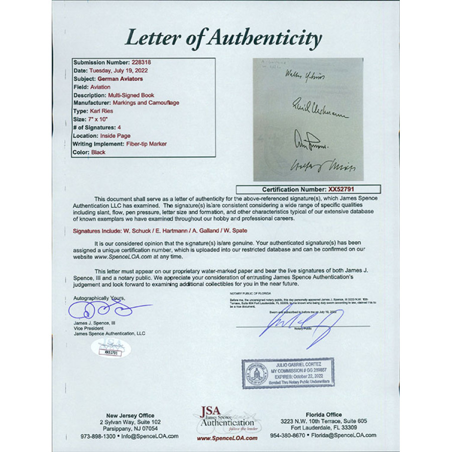 Signed Markings and Camouflage Systems of Luftwaffe Aircraft in World War II Hardcover book on the inside cover page by Walter Schuck, Erich Hartmann, Adolf Galland and Wolfgang Spate in black ink by all four. The book does show some use. This item has been certified by James Spence Authentication (JSA) with letter of authenticity.