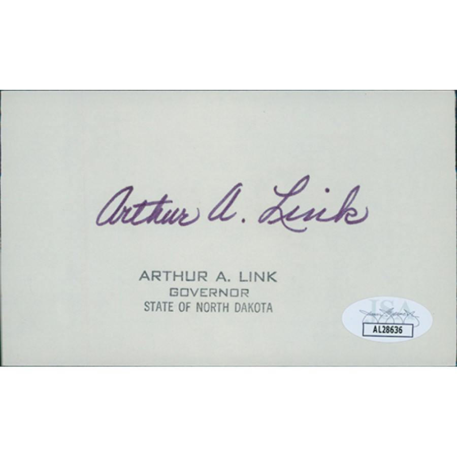 Signed Arthur Link 3x5 index card in black ink. This item has been certified by James Spence Authentication (JSA) with sticker affixed to item and matching card.