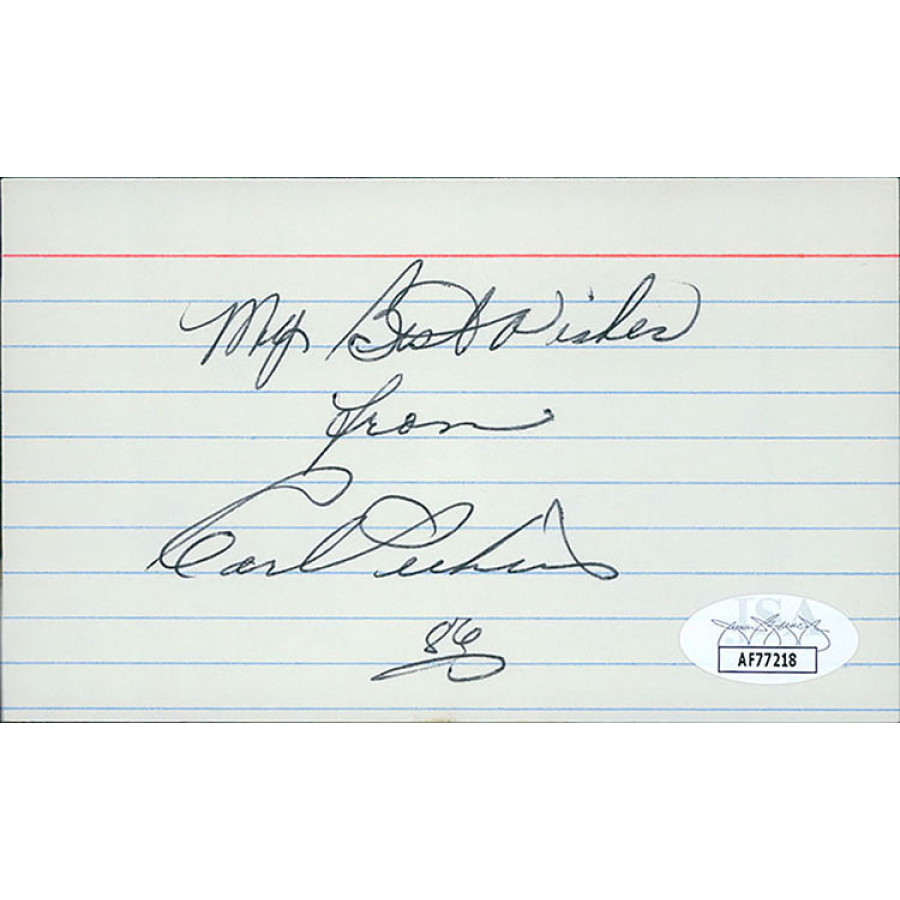 Signed Carl Perkins 3x5 index card in black pen. This item has been certified by James Spence Authentication (JSA) with sticker on item and matching card.
