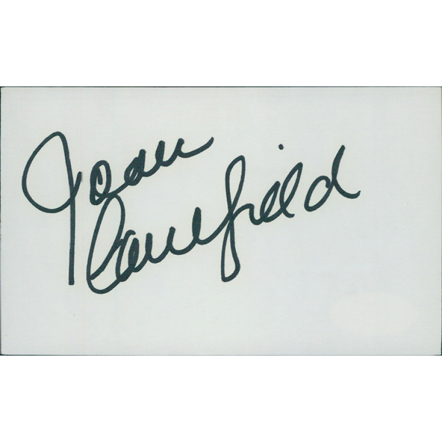 Signed Joan Caulfield 3x5 index card in black sharpie. This item has been certified by James Spence Authentication (JSA) with sticker on item and matching card.