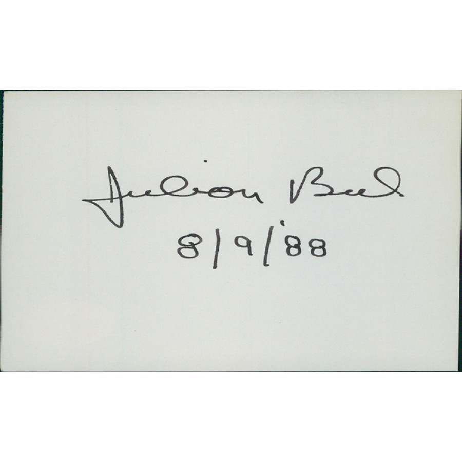 Signed Julian Bond 3x5 index card in black ink. This item has been certified by James Spence Authentication (JSA) with sticker affixed to item and matching card.