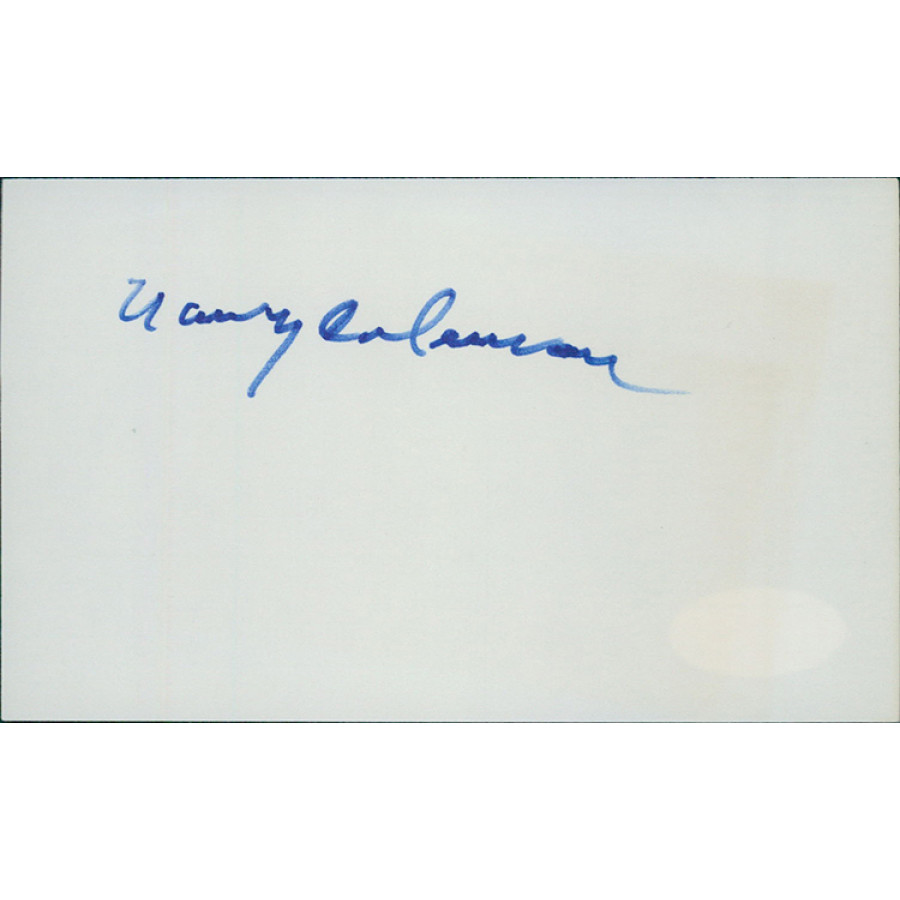 Signed Nancy Coleman 3x5 index card in blue sharpie. This item has been certified by James Spence Authentication (JSA) with sticker affixed to item and matching card.