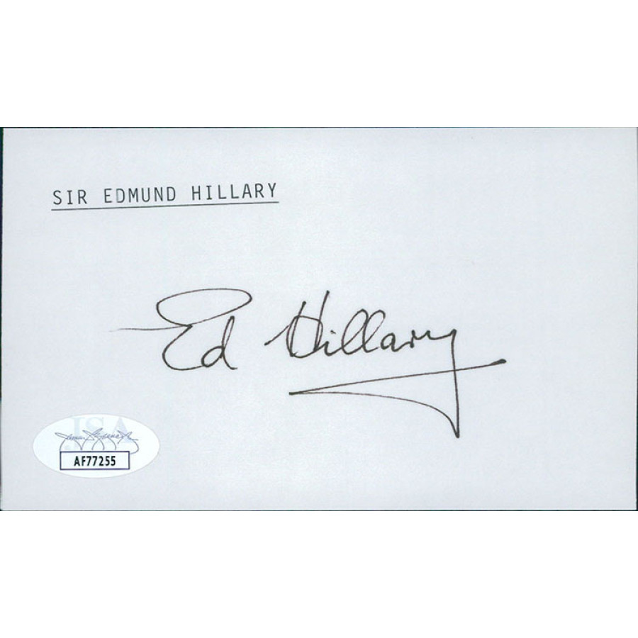 Signed Sir Edmund Hillary 3x5 index card in black ink. This item is certified by James Spence Authentication (JSA) with sticker affixed to item and matching card.