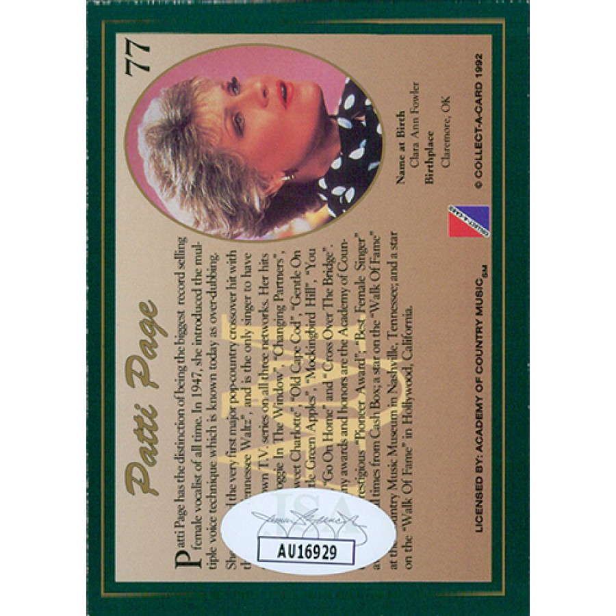 Signed Patti Page 1992 Collect-A-Card card #77 in black sharpie. This item is certified by James Spence Authentication (JSA) with sticker affixed to item and matching card.