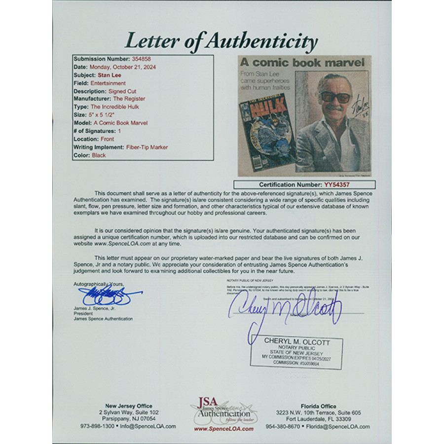 Signed Stan Lee 5x5.5 cut newspaper page in black ink. This item has been certified by James Spence Authentication (JSA) with sticker affixed to item and matching card.