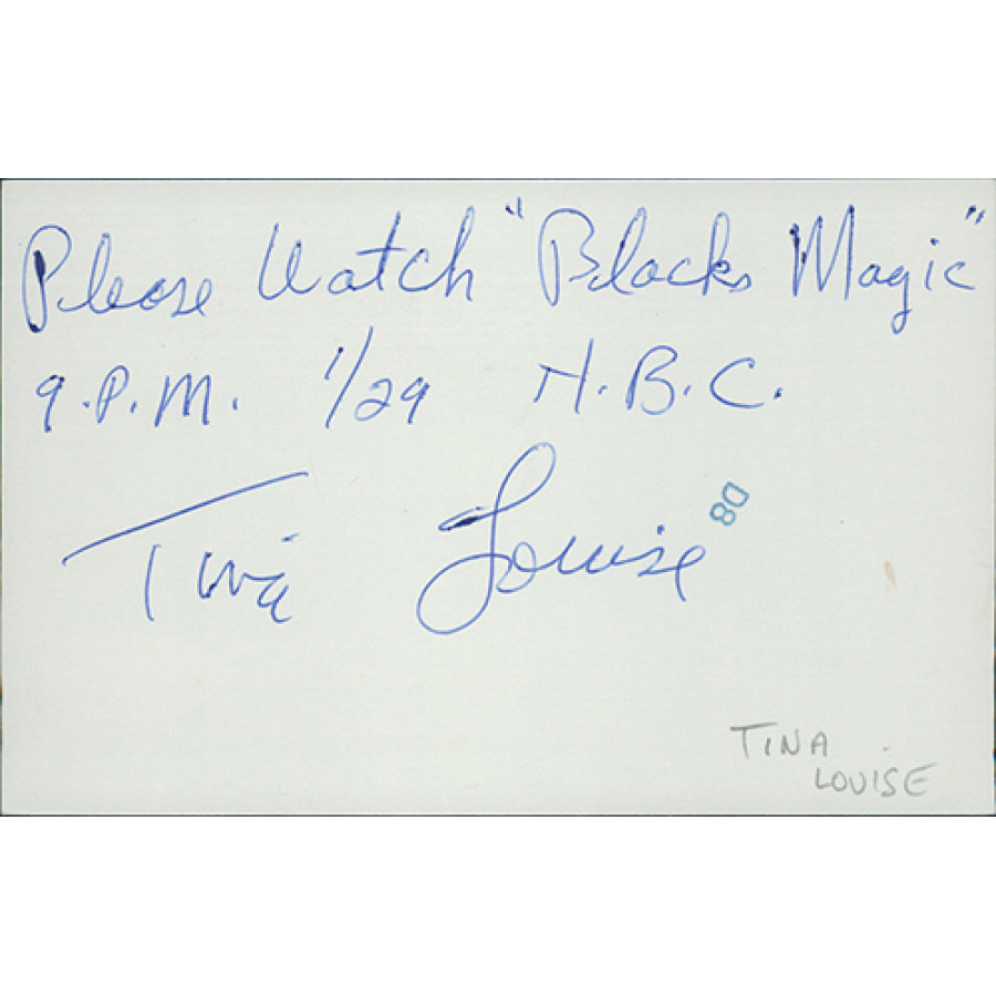 Signed Tina Louise 3.5x5.5 Postcard in blue pen with not "Please Watch Blacke's Magic 9PM 1/29 NBC". This autograph has been certified by James Spence Authentication (JSA) with sticker on item and matching card.