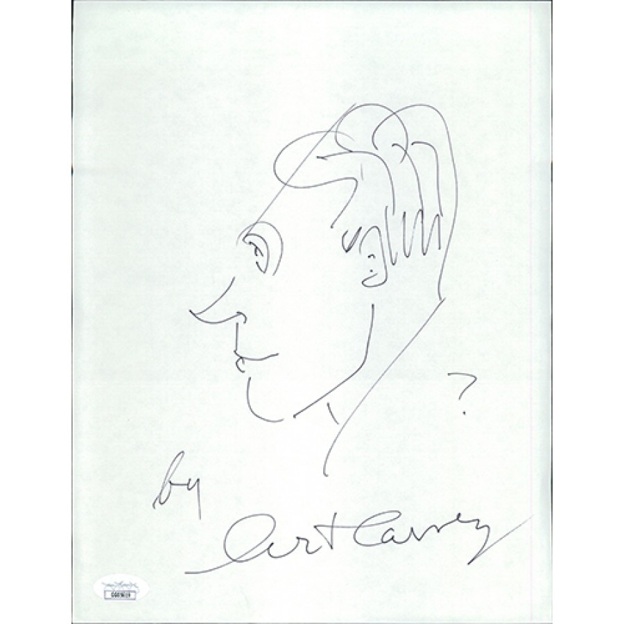 Signed Art Carney 8.5x11 Sketch on white card stock in black ink. This autograph has been certified by James Spence Authentication (JSA) with sticker affixed to item and matching card. Please see pics.