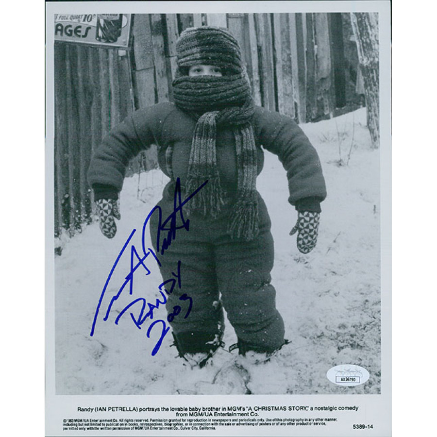 Signed Ian Petrella A Christmas Story 8x10 cardstock promo photo in blue sharpie. This item has been certified by James Spence Authentication (JSA) with sticker affixed to the item and matching card.