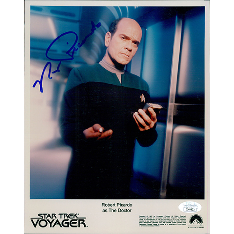 Signed Robert Picardo Star Trek Voyager 8x10 glossy finish promo photo in blue sharpie. The autograph has been certified by James Spence Authentication (JSA) with sticker affixed to item and matching card.