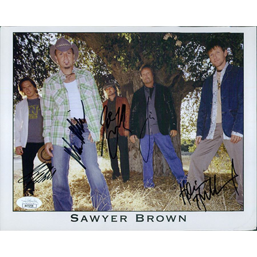 Signed Sawyer Brown 8x10 cardstock promo photo in black ink by all five members. The signatures include Mark Miller, Gregg "Hobie" Hubbard, Duncan Cameron, Joe Smyth and Jim Scholten. The photo has some scratches, kinks and corner dings. This item has been certified by James Spence Authentication (JSA) with sticker affixed to item and matching card.