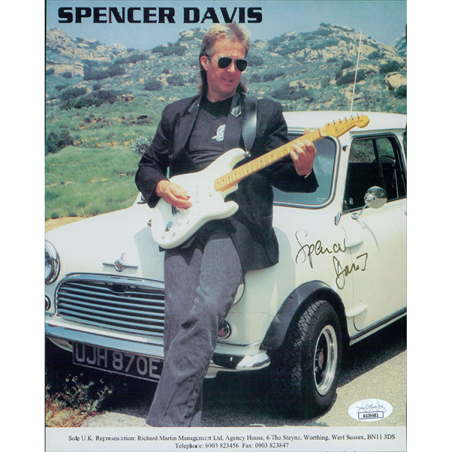 Signed Spencer Davis 8x10 cardstock promo photo in gold ink. The photo has light kinks and scratches. This item has been certified by James Spence Authentication (JSA) with sticker affixed to item and matching card.