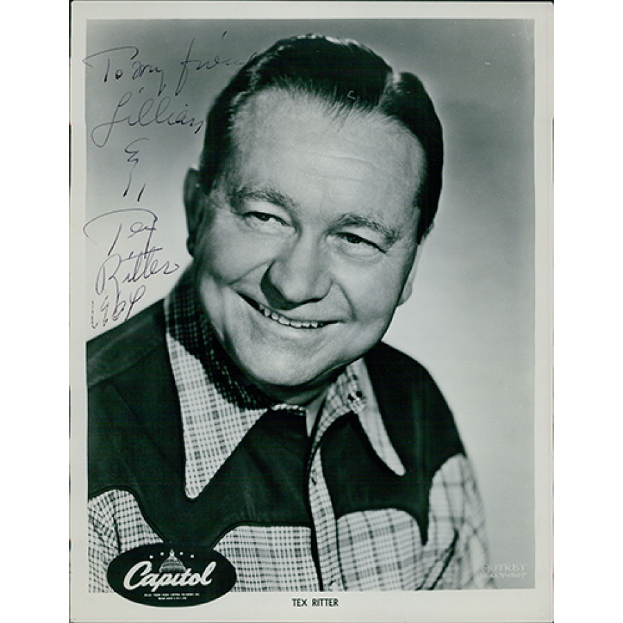 Signed Tex Ritter 8x10 original still photo in black pen personalized "To MY Friends Lillian". The autograph has been certified by James Spence Authentication (JSA) with sticker affixed to item and matching card.
