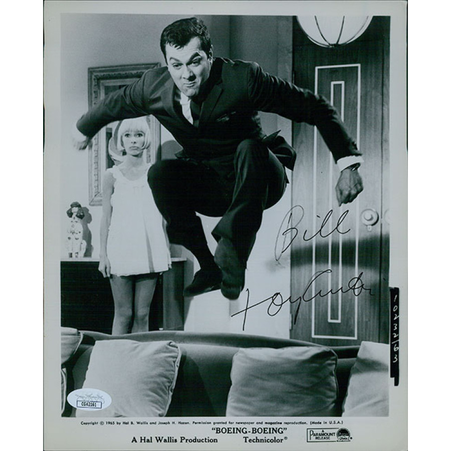 Signed Tony Curtis Boeing-Boeing 8x10 glossy finish original photo in black ink personalized "Bill". This item has been certified by James Spence Authentication (JSA) with sticker affixed to item and matching card.
