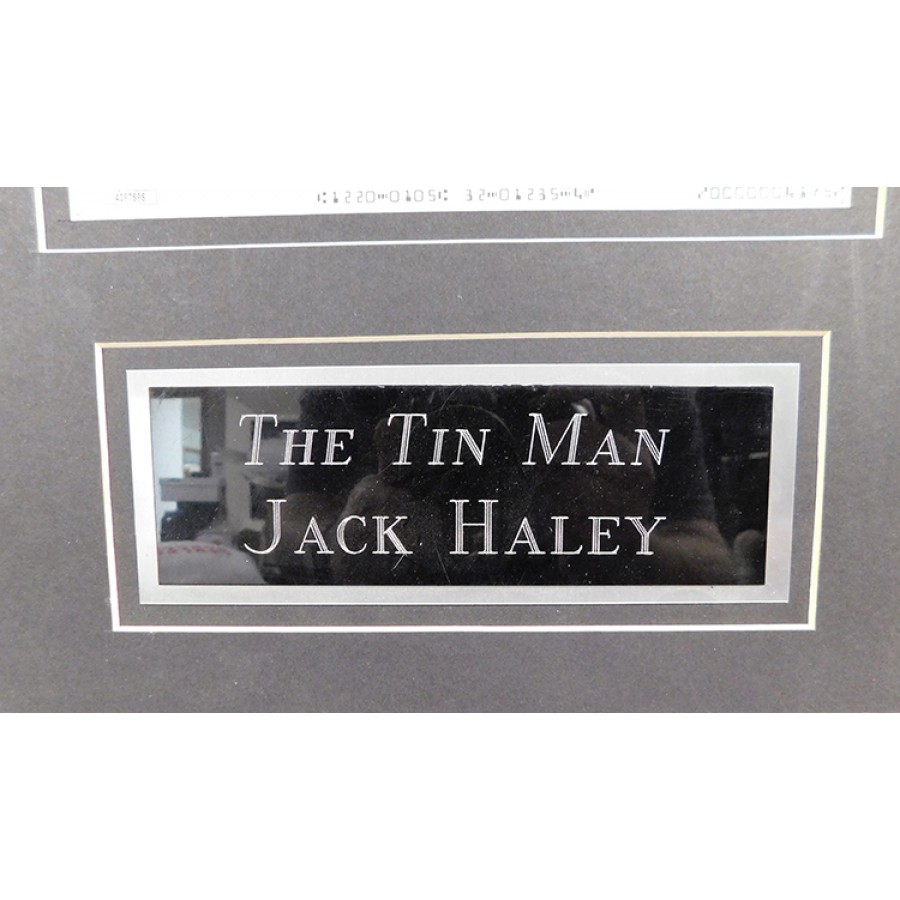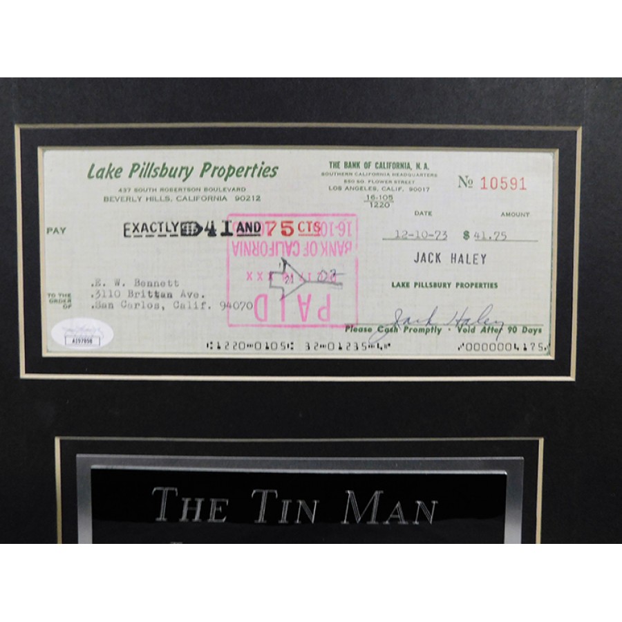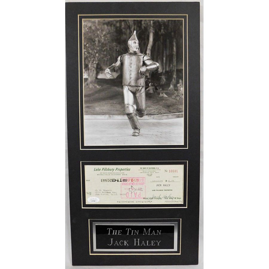 Signed Jack Haley cancelled check in blue ink Matted with an 8x10 photo and name plate. The matting measures about 10.5x21.5 inches. There is some scratching to the photo and name plate. This item has been certified James Spence Authentication with sticker affixed to item and matching card.