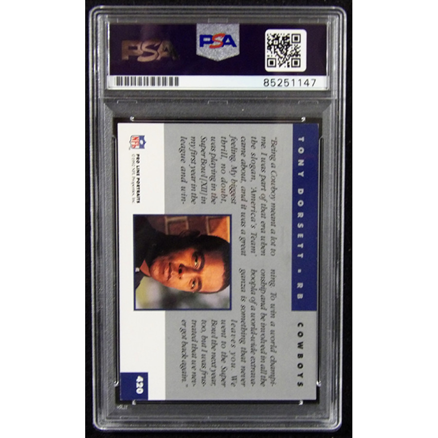 Signed Tony Dorsett 1992 Pro Line Portraits card #420 in gold ink. This item is certified by Professional Sports Authenticator (PSA) encapsulated.