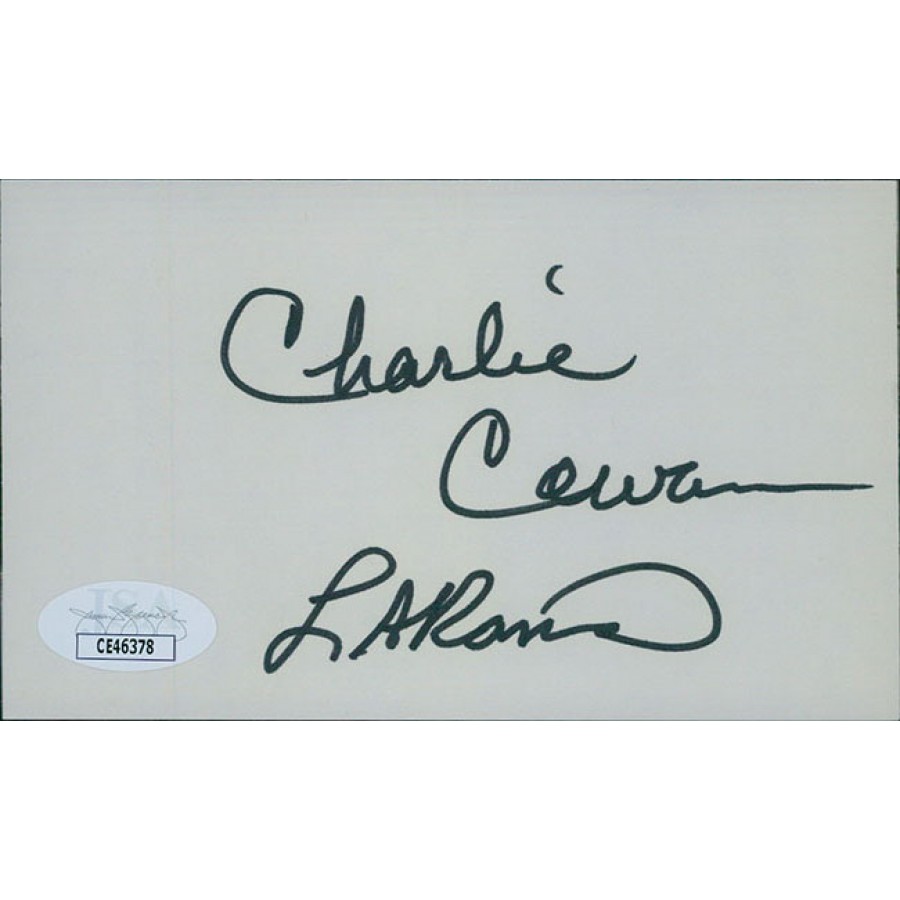 Signed Charlie Cowan 3x5 index card in black ink. This item has been certified by James Spence Authentication (JSA) with sticker affixed to item and matching card.