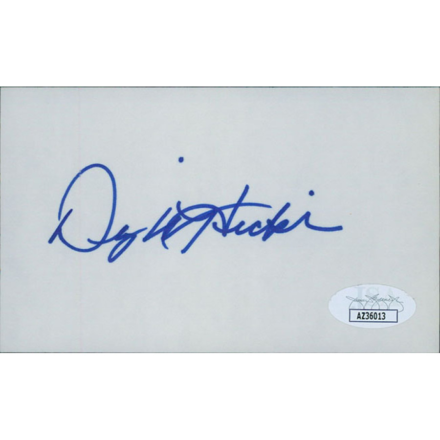 Signed Dwight Kicks 3x5 index card in blue sharpie. This item has been certified by James Spence Authentication (JSA) with sticker affixed to item and matching card.