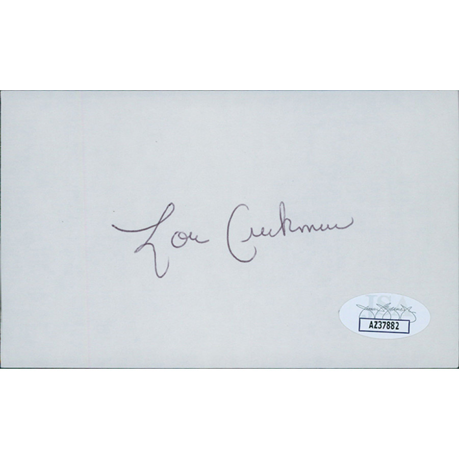 Signed Lou Creekmur 3x5 index card in black ink. This item has been certified by James Spence Authentication (JSA) with sticker affixed to item and matching card.