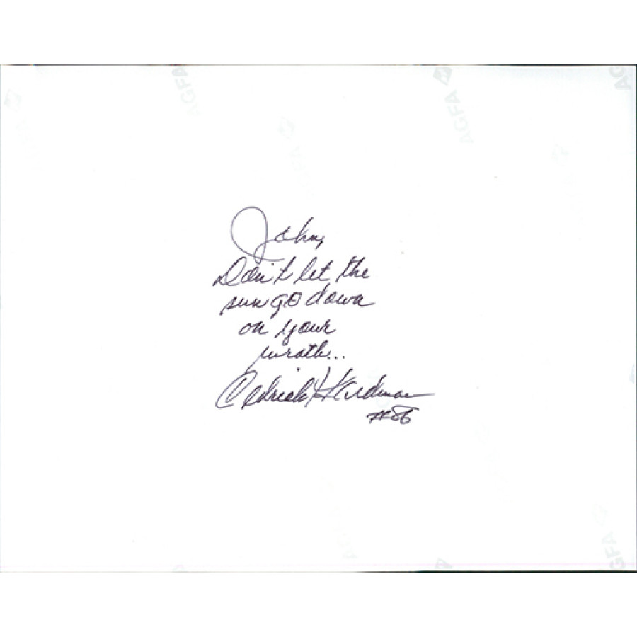 Signed Cedrick Hardman Oakland Raiders 8x10 glossy photo in silver ink. The signature has chipped off and the photo has some kinks and light creases. It is also personalized and signed on the back of the photo. This item is certified by James Spence Authentication (JSA) with sticker affixed to item and matching card.