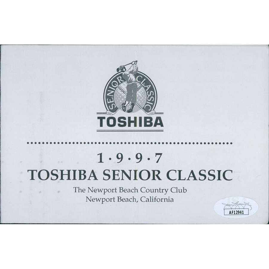 Signed Bob Murphy 1997 Toshiba Senior Classic used scorecard in pencil. The pamphlet measures 4x12 inches when folded out. The pamphlet does show use and has creases, scratches, kinks and other markings. This item has been certified by James Spence Authentication (JSA) with sticker on item and matching cert.