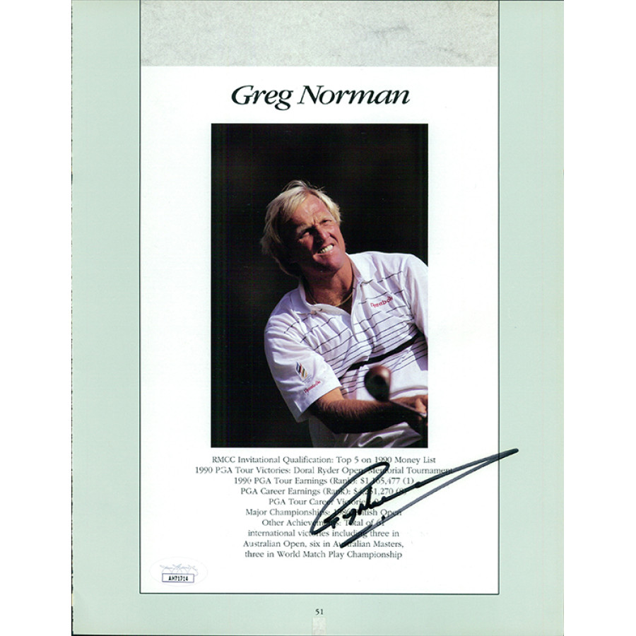 Signed Greg Norman 8.5x11 cut page in black sharpie. This item has been certified by James Spence Authentication (JSA) with sticker affixed to item and matching card.