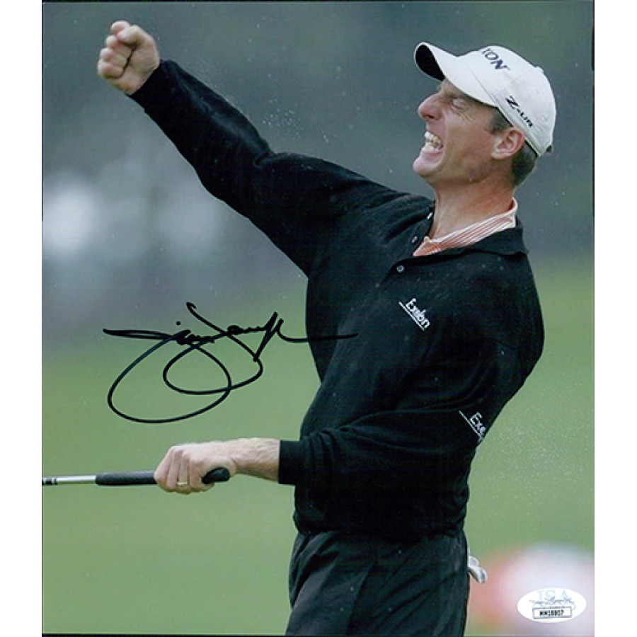 Signed Jim Furyk 8x9 matte finish photo in black sharpie. This autograph has been certified by James Spence Authentication (JSA) with sticker affixed to item and matching card.
