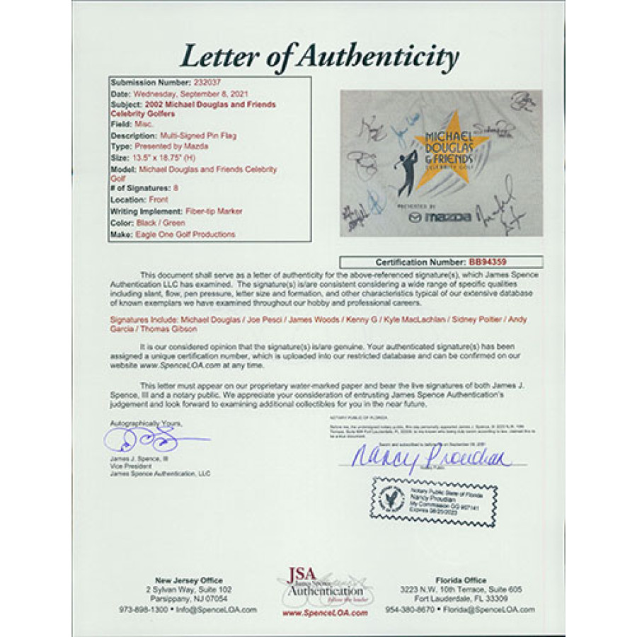 Signed Michael Douglas and Friends Celebrity Golf Flag by 8. The signatures include Michael Douglas, Joe Pesci, James Woods, Kenny G, Kyle MacLachlan, Sidney Poitier, Andy Garcia and Thomas Gibson. This item has been certified by James Spence Authentication (JSA) with sticker on item and matching letter of authenticity.