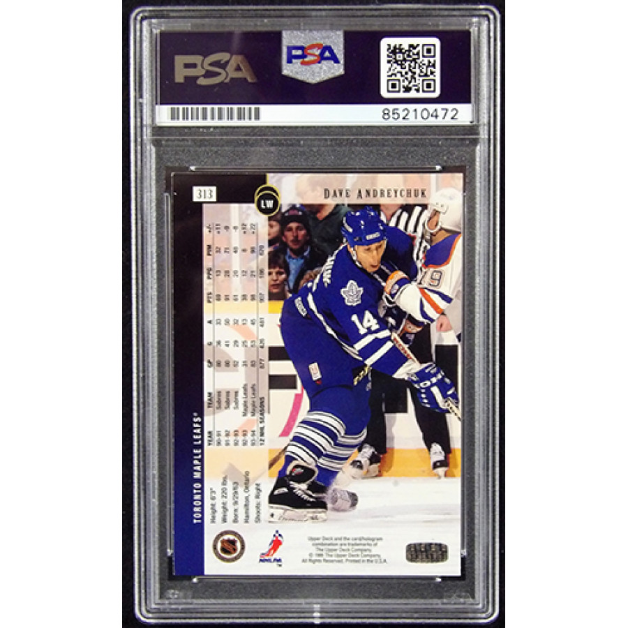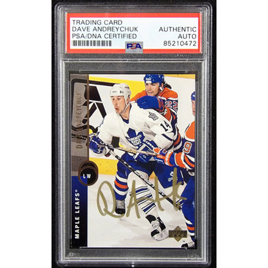 Signed Dave Andreychuk Toronto Maple Leafs 1994-95 Upper Deck hockey card #313 in gold ink. This item is certified by Professional Sports Authenticators (PSA) encapsulated.
