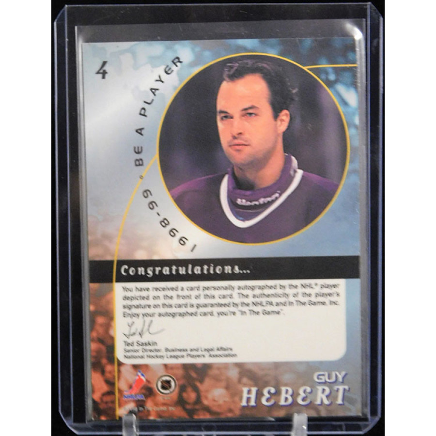 Signed Guy Hebert Anaheim Mighty Ducks Signed 1998-99 In The Game Be A Player Silver Hockey Card #4. Please see pics. The card has some surface scratches and nicks.