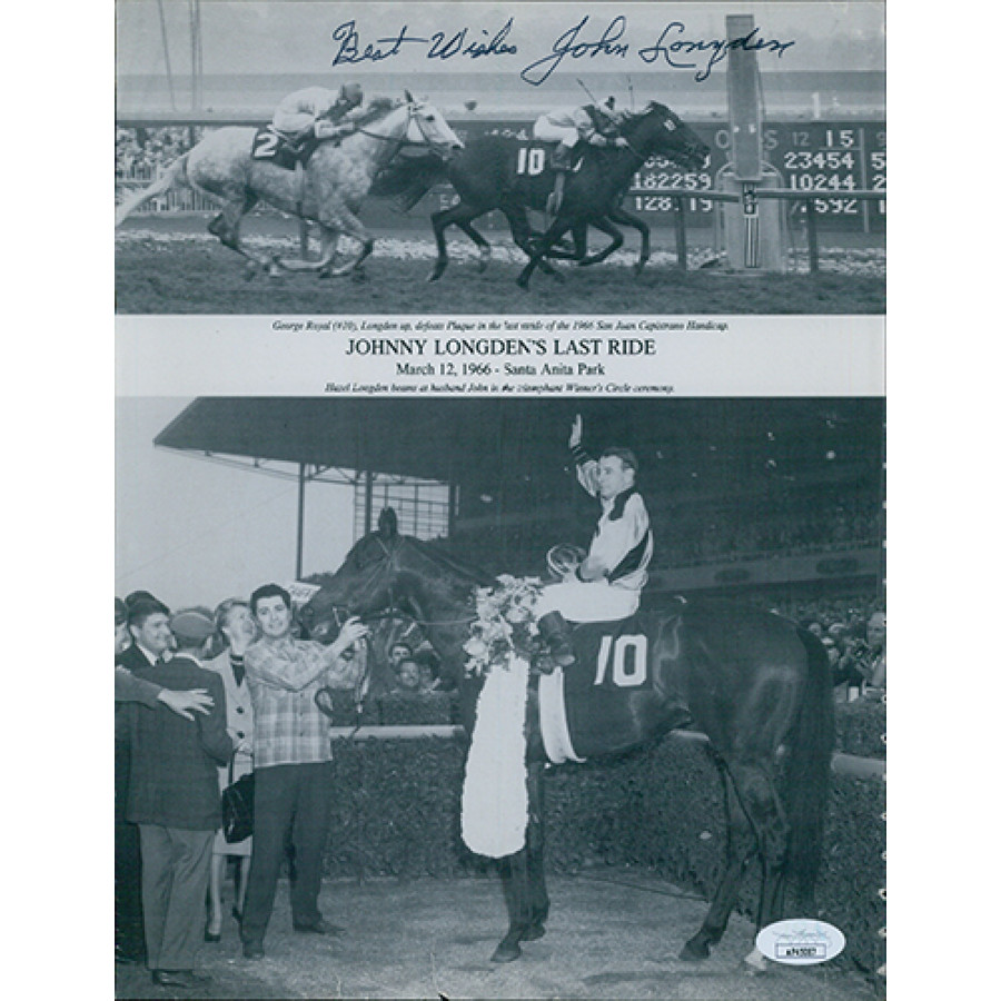 Signed Johnny Longden 8.5x11 page photo in black ink. The page has some rips, creases and light wearing. This item has been certified by James Spence Authentication (JSA) with sticker affixed to item and matching card.