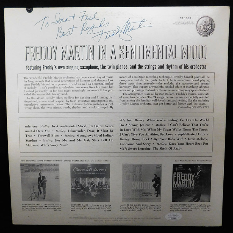 Signed Freddy Martin In A Sentimental Record Album on the back cover in blue ink personalized "To Ina and Fred". The album does show use and has scuffing, tearing and kinks throughout. This item has been certified by James Spence Authentication (JSA) with sticker affixed to item and matching card.