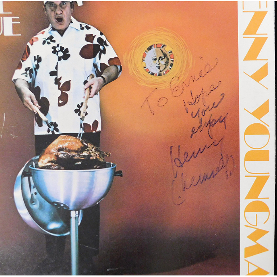 Signed Henny Youngman And A Little Barbecue On The Side! Record Album on the cover in blue ink personalized "To Ernie". The album does shows use and has scuffing, creases and wearing. This item has been certified by James Spence Authentication (JSA) with sticker affixed to item and matching card.