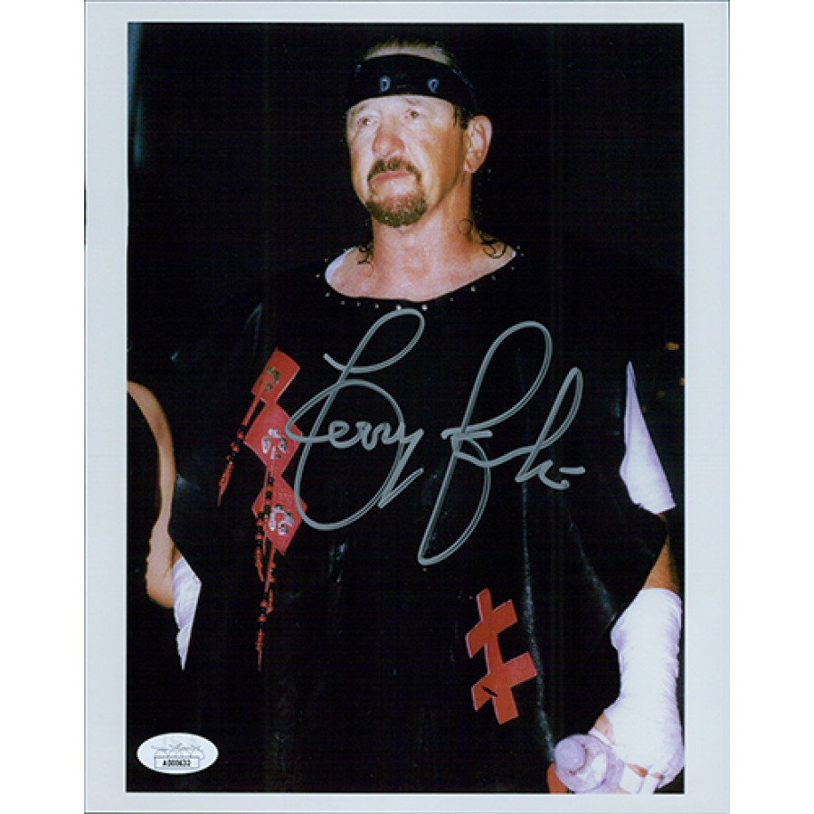 Signed Terry Funk 8x10 glossy finish photo in silver sharpie. This autograph has been certified by James Spence Authentication (JSA) with sticker affixed to item and matching card.