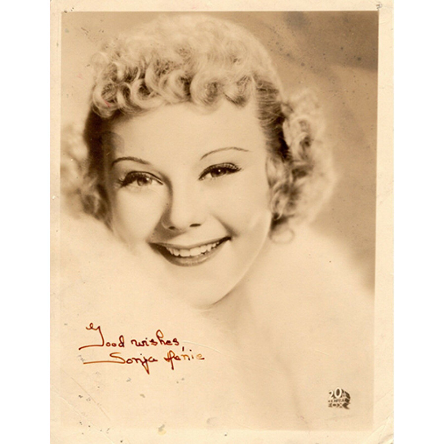 Signed Sonja Henie 5.5x7 vintage black and white photo with the imprinted 20th Century Fox logo in the bottom right corner. This item has been certified by James Spence Authentication (JSA) #S93433 with sticker affixed to item and matching card. there are pinholes in the top corners and a crease in the bottom left side and all around dented corners.