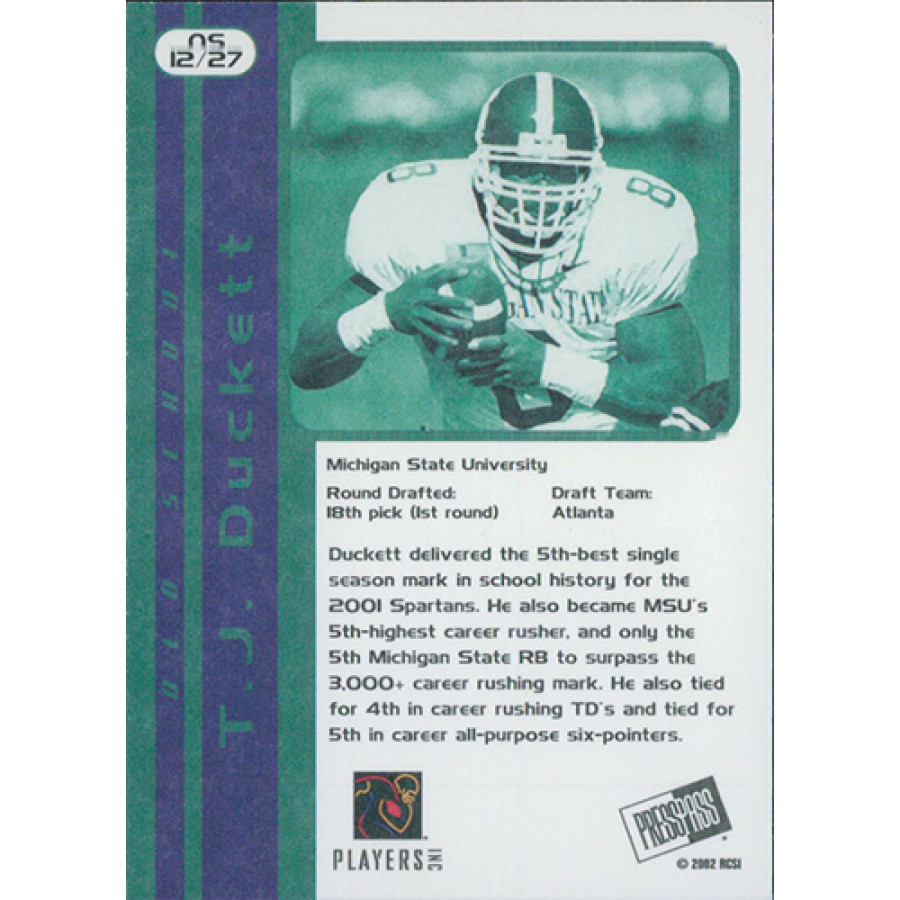 T.J. Duckett 2002 Press Pass JE Old School Football Card #OS12. The card is embossed The Gem Collection 1 of 1.