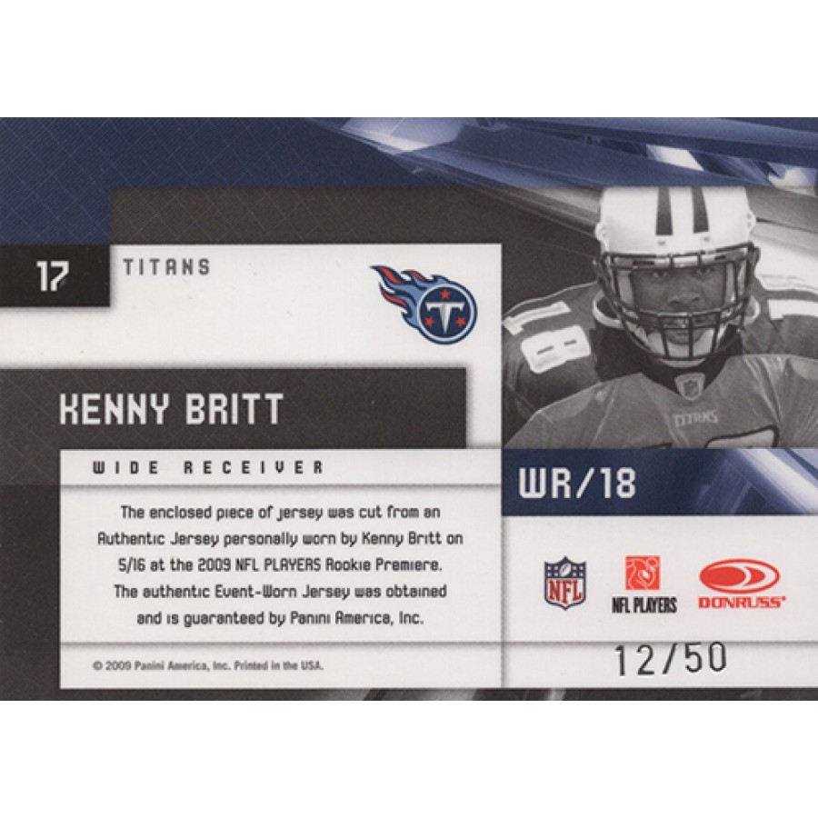 Kenny Britt Tennessee Titans 2009 Limited Rookie Jumbo Jersey Football Card #17. This is numbered 12 of 50.