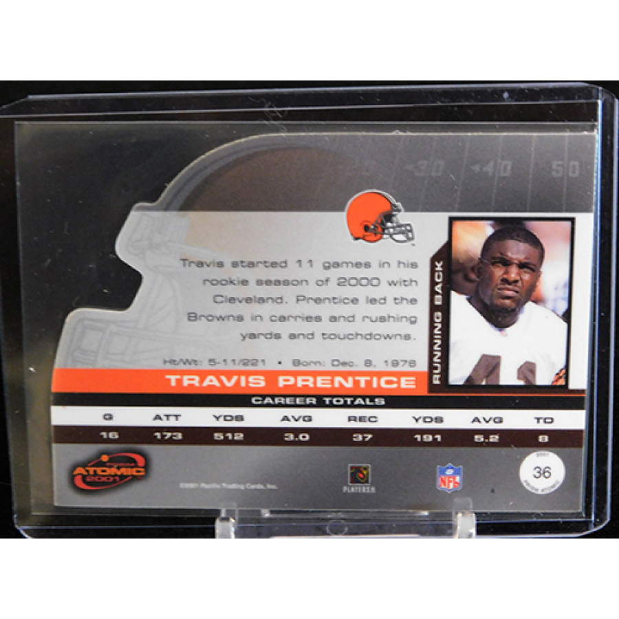 Travis Prentice Cleveland Browns 2001 Pacific Prism Atomic Football Card #36. The card is embossed Special Olympics Nevada 1 of 1.